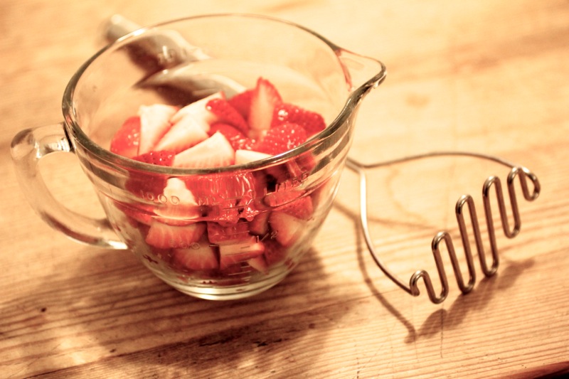 2. With an electric mixer on medium-high speed, cream butter, sugar, and vanilla until fluffy. Add whole eggs and the white, one at a time, beating until each is incorporated, scraping down the sides of bowl as needed. Reduce speed to low. Add flour mixture in two batches, alternating with the milk, and beating until well combined. Fold in chopped strawberries by hand.