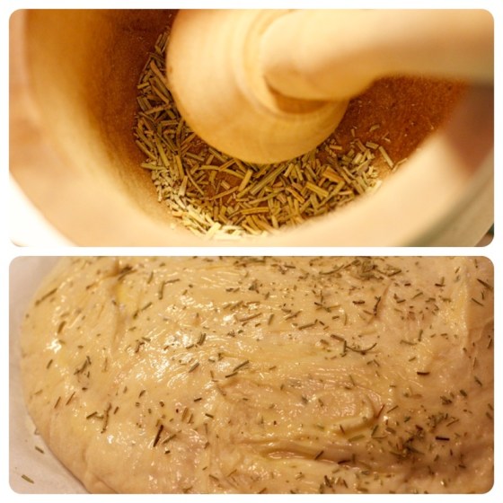 Preheat your oven to 400. This won’t obviously take 45 minutes, so just be mindful of how long your oven takes to heat up. Take the risen loaf and brush it with the egg wash (1 egg + 1Tbsp water), and sprinkle some dried rosemary over the top. I like to crush mine up a little before sprinkling, but that’s because I don’t like to bite into big pieces of rosemary.
