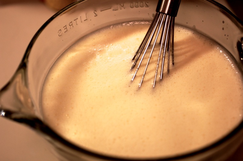 Once your yolks are whipped and your cream/vanilla mixture is hot it’s time to combine. Start by slowly pouring about a cup of hot cream into your whisked yolks. You’ll need to actually keep whisking while you pour, so you may need a 3rd hand if you’re not used to multi-tasking. You’ll need to get everything incorporated slowly so as not to cook the eggs. After the first cup is in, and your yolks tempered you can slowly pour in the rest of the cream – keep whisking until it’s all combined.