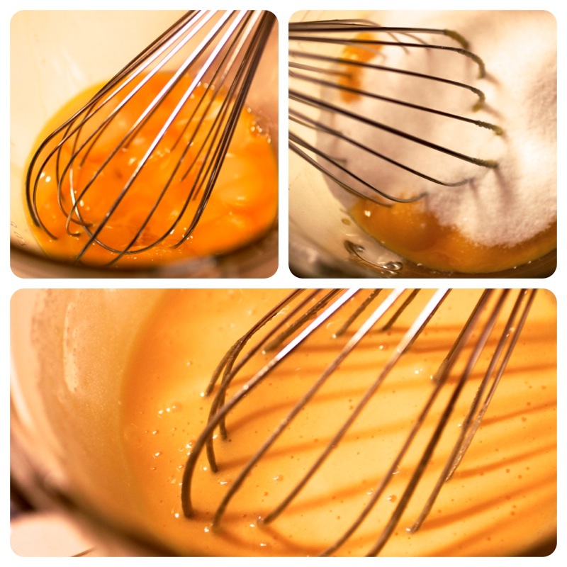 Next on your to-do list is start whisking your egg yolks with your sugar. They’ll go from a nice deep yellow to a lighter, fluffier, paler yellow. And you’ll get a nice work out in the process. You’ll need to whisk until you get tired, and then whisk some more.