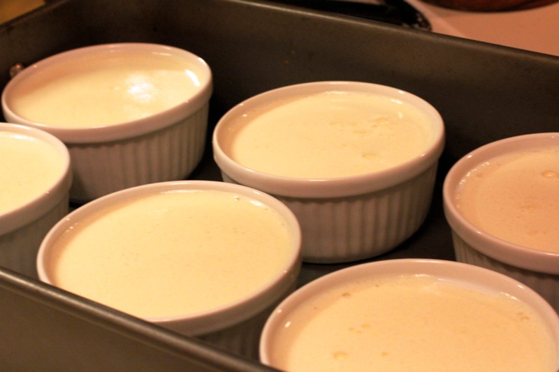 Take your ramekins and place them in a roasting pan. If you don’t have a roasting pan, any baking sheet/dish that has higher sides will work just fine. The whole idea of having them in another pan is so that you can bake them off in a water bath. This is why you boiled that water to begin with – yay planning ahead! Pour your custard into each ramekin and place the roasting pan into your preheated oven.