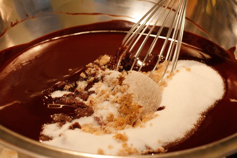 That bottom right photo doesn’t take long, and it’s fantastic. Refrain from eating it by the spoonful :) Once everything is completely melted turn off the heat, but keep the bowl over the water. Now you can add the sugars.