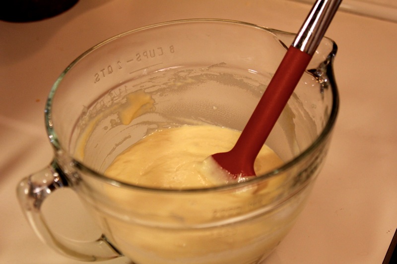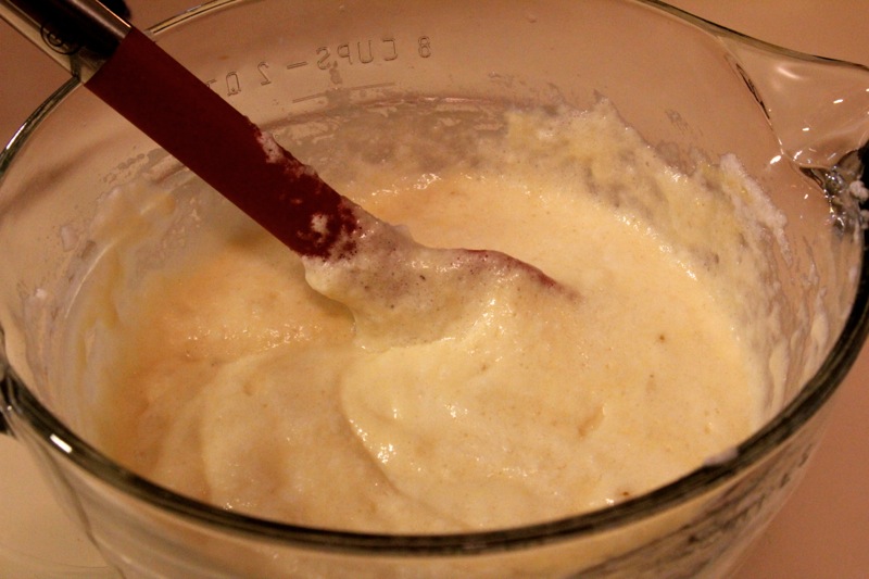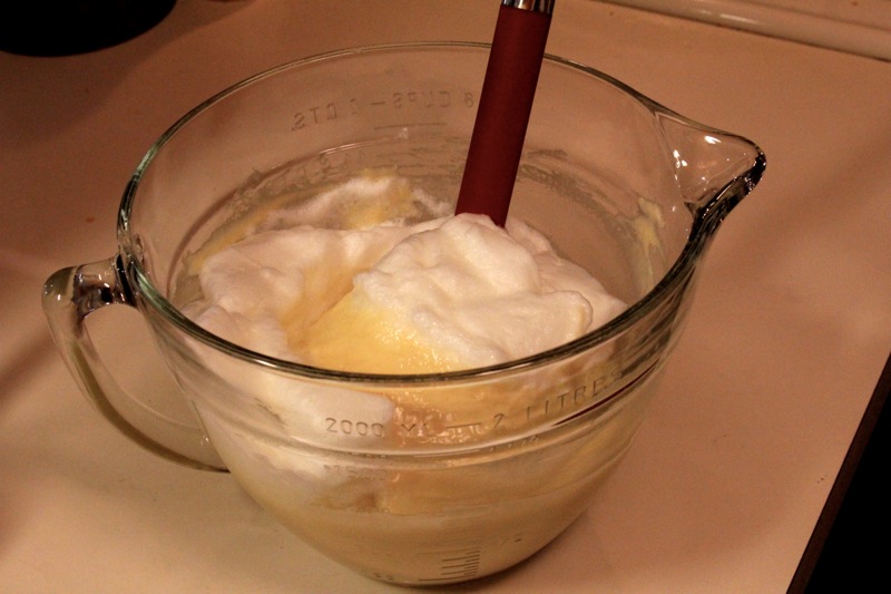 Start by heating up your milk to luke warm. You could heat up the stove, but I find that 30 seconds in the microwave works just as well. Next, whisk in your egg yolks (we’ll used the whites later), melted butter, and sugar. Add in your flour & baking powder and whisk again until everything is combined and no lumps remain. Easy enough, right?