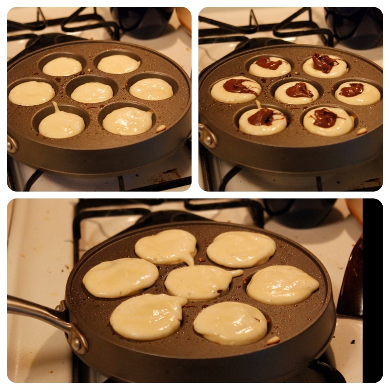 Spoon in about 1 tablespoon of batter into each well and let it cook for 30 seconds. This doesn’t have to be a precise measurement of time, but don’t rush it. Drop in 1 tsp of Nutella (or your preferred filling) and cover with about another teaspoon of the ebelskiver batter.