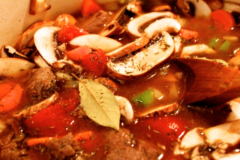 Stir in your mushrooms, tomatoes, water (or wine), broth, bay leaves, thyme, salt & pepper, and potatoes. Bring this all to a boil, then reduce the heat and simmer for 1 hour.