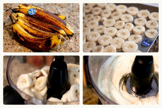 It’s so simple – take a few bananas (I like to use ones that are nice and ripe), cut them into thin, coin-like slices, freeze, and blend.