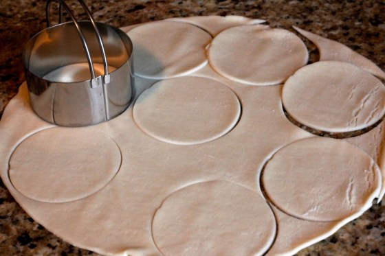 Since we’re using the pre-made refrigerated pie crust, you’ll want to make sure you let it sit out on the counter for a 10-20 minutes so it’s easier to roll out. Once it’s at room temperature cut circles in the dough using a biscuit cutter (or a large glass) to get pieces of crust that will cover over a regular size muffin pan. You may have to reroll to use all the dough.