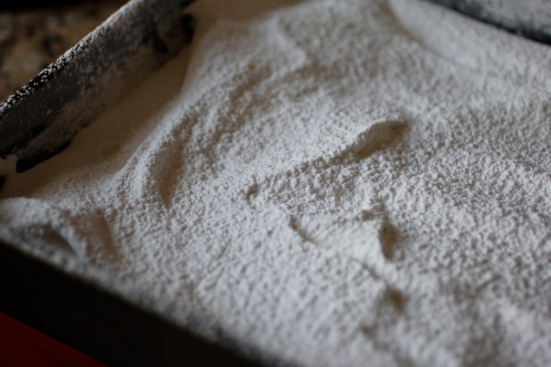Oil a 9×13 rectangular, metal baking pan before you dust the bottom and sides with some powdered sugar. I absolutely suggest this type of pan – it just makes for more shapely marshmallows.